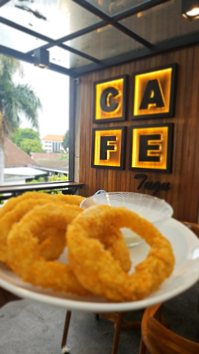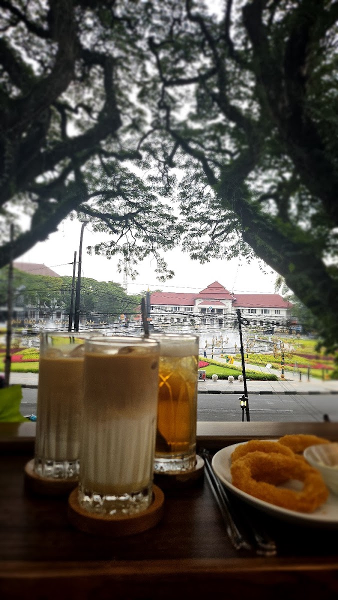 Located in front of Balai Kota Malang, easy to access. They have spacious seating areas, indoor, outdoor and upstairs. They have various coffee, non coffee, snacks and main courses. I had hot cappucino and onion rings. Taste good.